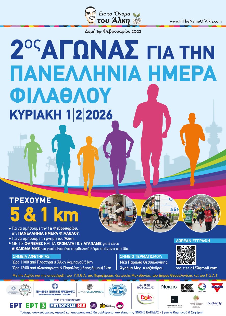 Η Δομή 1ης Φεβρουαρίου 2022 – Εις το Όνομα του Άλκη, ένα μη κερδοσκοπικό σωματείο που βασίζεται στον Εθελοντισμό, ανακοινώνει τη διοργάνωση του 2ου Αγώνα δρόμου για την ΠΑΝΕΛΛΗΝΙΑ ΗΜΕΡΑ ΦΙΛΑΘΛΟΥ.